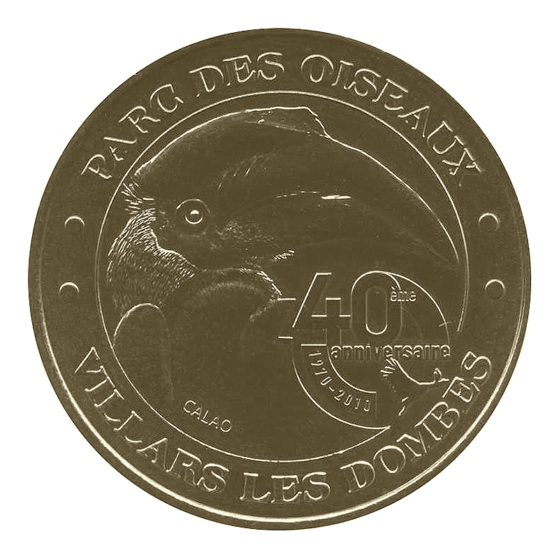 En 2010, pour la première fois, le Parc des Oiseaux présente ses oiseaux africains au sein d'une nouvelle biozone consacrée à l'Afrique : la terre de Calaos. Le thème de ce jeton frappé pour le 40ème anniversaire du Parc des Oiseaux était donc tout trouvé.