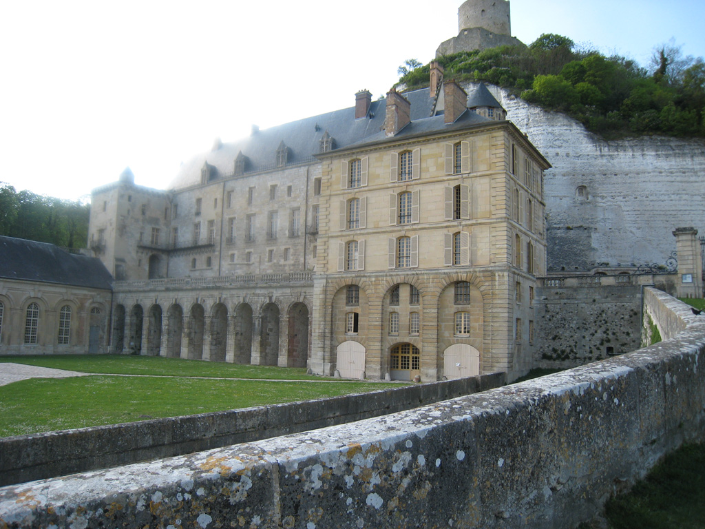 ...le château de La Roche-Guyon vu de face.Du Moyen Age à nos jours, ce château étrange et mystérieux marque les esprits...Adossé à la falaise, dominant une boucle de la Seine, il s'est développé au fil des siècles, mélangeant avec élégance les styles architecturaux.Son donjon fortifié domine la vallée de la Seine depuis le XIIe siècle. Il est relié à la forteresse du bas par un souterrain taillé en escalier.Pour la petite histoire :Le château de La Roche-Guyon et le village servent de toile de fond à l'aventure du héros de BD le professeur Philip Mortimer, de Blake et Mortimer, intitulée Le Piège diabolique.