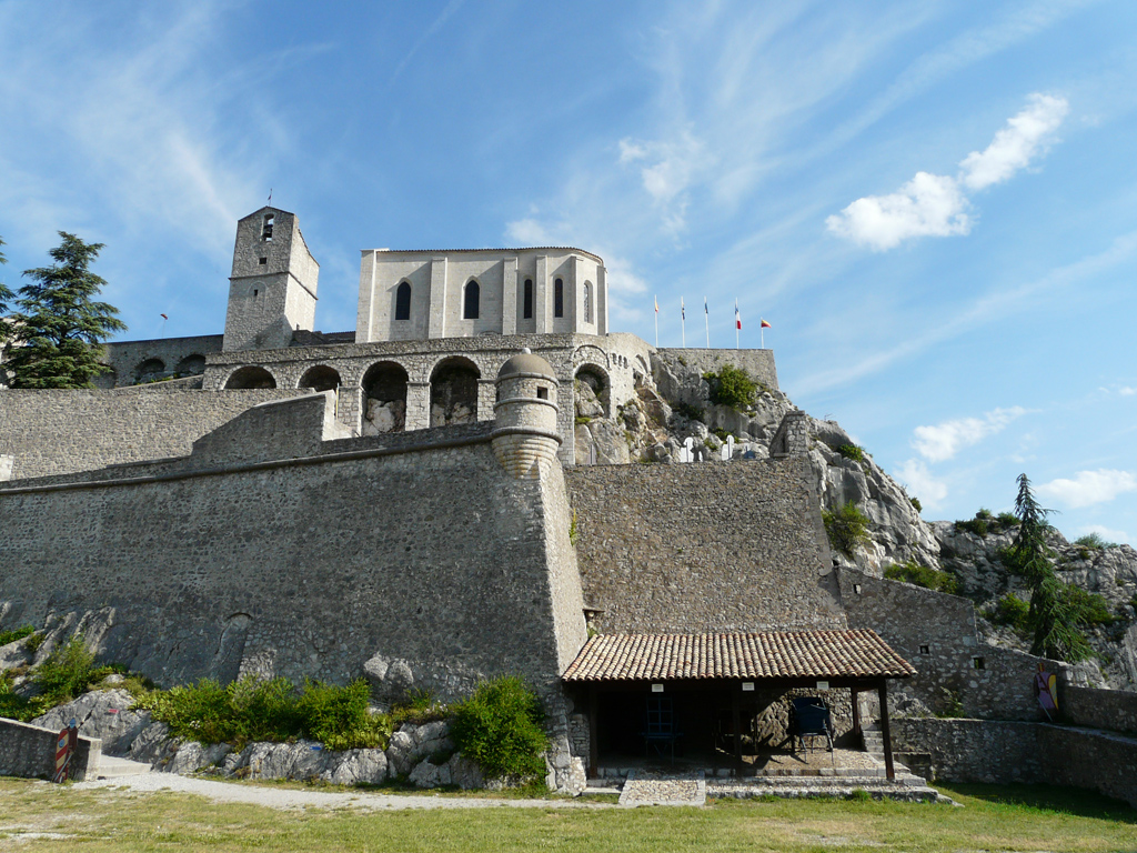 La citadelle, du haut de ses 500 m d'altitude, est la pièce maîtresse de la ville (XIème - XIIIème - XVIème - XIXème s.). Jehan Sarrazin, ingénieur militaire d'Henri IV, puis Sébastien Vauban l'ont marquée de leur sceau. Les Tours, soudées aux ouvrages de la Citadelle, font partie de l'enceinte élevée vers 1370 pour protéger la ville des bandes armées refluant de France. Les remparts, en majeure partie, et les portes ont été abattues au XIXe siècle. Prosper Mérimée sauva le 5 dernières tours, qu'on voulait aussi jeter bas. Ce visuel est une œuvre de Frédérique Maillart, sculpteur-graveur.
